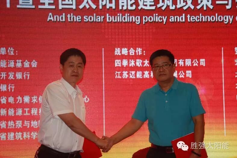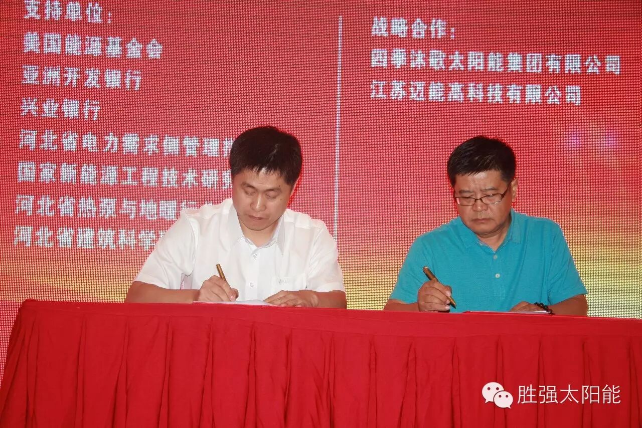 胜强太阳能公司周建总经理与北京中兴广源热源公司卫臣民总经理,在会议现场签约了战略合作协议!